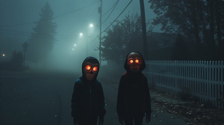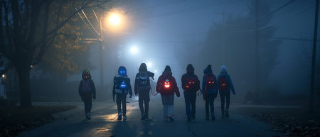 A group of children illuminated with glowing backpacks walks together down a foggy street at night, blending safety with the spooky spirit of the season. Their silhouettes create an image filled with mystery and a youthful sense of adventure.
