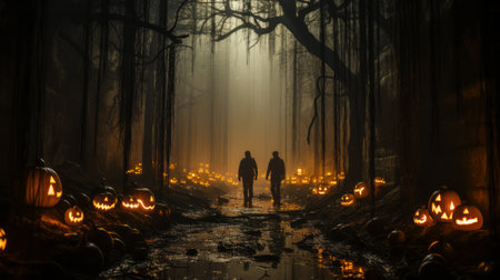 On a warm, foggy night, two people wander through the mystical forest, illuminated by the bright glow of pumpkins and the crackling warmth of a campfire