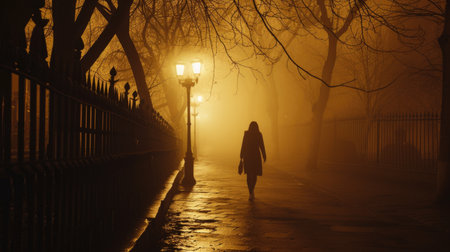 illustration of fog in the park at night, soft focus, one person