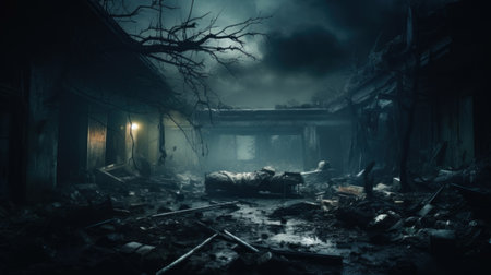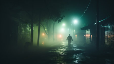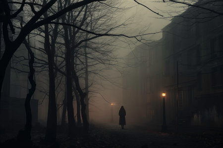 An AI-generated illustration of an eerie fictional street scene with a person walking in the distance