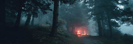 A dark and foggy forest filled with lots of trees. Generative AI image.