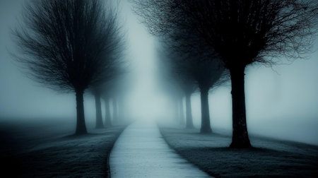 A thick eerie mist blankets an empty street creating an unsettling atmosphere. Bare trees rise from the ground enhancing the chilling Halloween vibe of the scene.