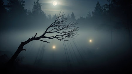 Dark and misty forest with eerie fog swirling around twisted tree silhouettes and a dimly glowing street lamp nearby, creating a suspenseful mood.