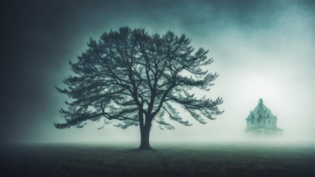 lone tree standing in a foggy landscape, with mist swirling around its branches, creating a mysterious atmosphere