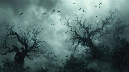 A dark, misty landscape features a dilapidated manor surrounded by barren trees, with flocks of birds soaring through the fog at dusk, creating an atmospheric, haunting ambiance.