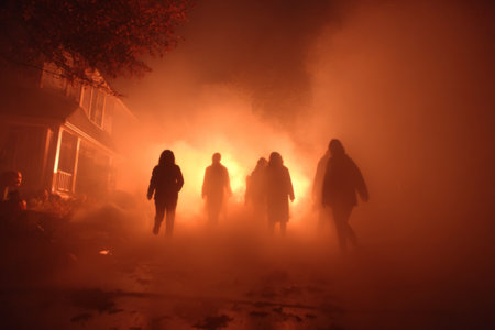 Groups of individuals walk through dense fog illuminated by an orange glow. The night setting near a house creates a mysterious and haunting atmosphere, enhancing the sense of intrigue.