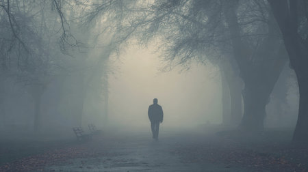 A solitary figure navigates through dense fog in a tranquil park, representing lives uncertainties and the quest for clarity.