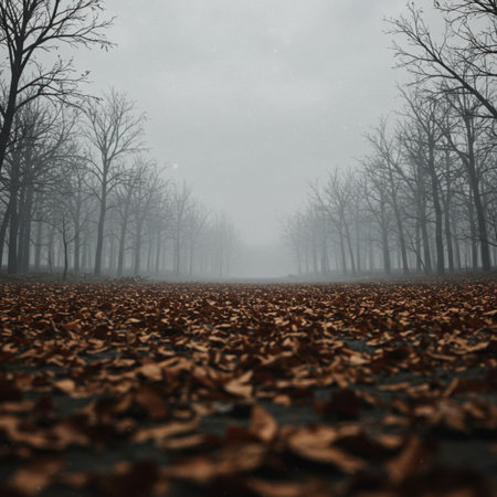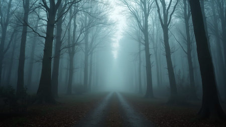 Gloomy Woodland Landscape, Misty Forest Trail, Spooky Halloween Scenery, Dense Forest, Dark and Mysterious, Halloween Themes, Eerie and Ominous, Bare Trees in Fog, Dark Woods Scene