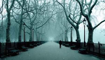 Paved path through a park, lined with leafless trees and dark benches. A solitary figure walks down the path in a misty, muted-toned atmosphere. The scene is suggestive of a quiet, contemplative mood.