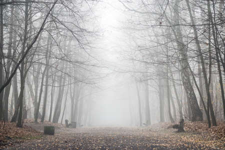 Foggy autumn landscape. Dark forest with bare trees and fallen leaves.