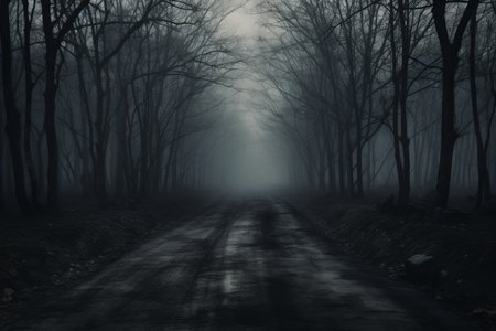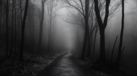 A monochrome image of a path winding through a dense, misty forest. Bare trees line the path, creating a spooky, atmospheric scene with a sense of mystery and isolation.