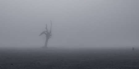 Creepy silhouette of dead tree stump stands alone in a foggy field