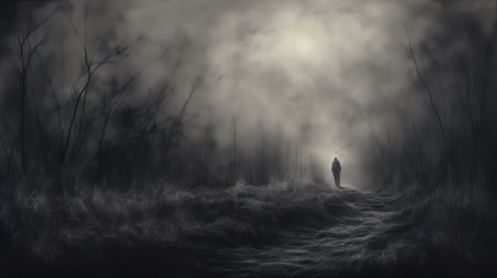 the dark forest envelops the lone figure in kate ryan's art, showcasing her expertise in photo-realistic landscapes. her monochrome landscapes captivate with their atmospheric and ethereal horror elements. the finely textured brushwork adds depth and dimension to her tenebrism-inspired paintings, reminiscent of the works of michal lisowski. ai generated