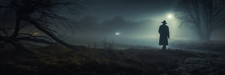 a person stands in the fog, surrounded by trees, holding a flashlight. this eerie photo captures the essence of psychological horror and desolate landscapes. the dark cyan and blue tones add a dramatic and somber atmosphere, reminiscent of faded memories. the image evokes a sense of hikecore, blending elements of nature and suspense. ai generated
