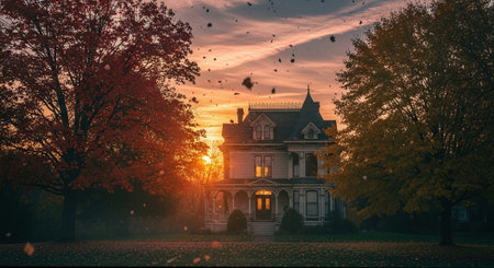 Old house in autumn park at sunset. Halloween background. Vintage style