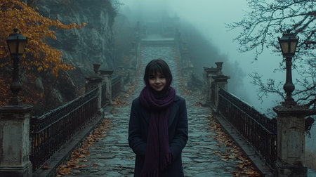 Generative AI Image of European Girl Wearing Warm Clothes in Bridge with Fog in Winter Season