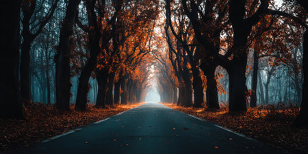 A serene autumn road winds through a misty forest, framed by vibrant orange and yellow leaves. Experience the tranquility of nature's beauty in this enchanting setting.