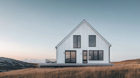 Exterior of a Nordic house with white wooden panels, large windows, and clean lines. A clear sky provides ample space for copy, emphasizing the home modern yet cozy style.
