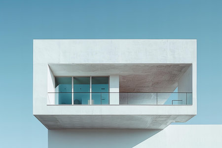 Sleek and minimalist structure showcases innovative architectural design with expansive glass elements. The buildings strong lines and concrete features are highlighted by a bright blue sky.