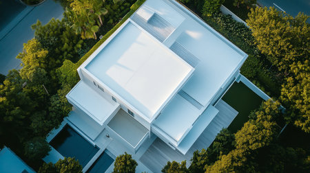 Captivating aerial view of a modern home nestled in lush greenery, showcasing innovative architectural design and a harmonious blend with nature, offering tranquility.