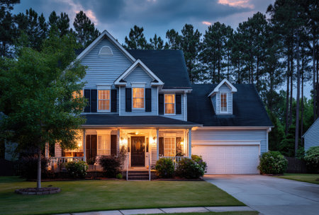 This image showcases a residential house featuring a porch, lawn, and surrounding trees. The house has a traditional architectural style. The scene is illuminated by exterior lighting creating a warm and inviting atmosphere. Suitable for use in real estate promotions, architectural designs, and lifestyle content, suggesting a peaceful environment.