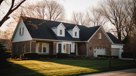 symmetric dormers on a yellow cape cod at sunset, created with generative ai