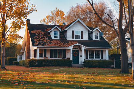 Panoramic view of beautiful classic American house in autumn.