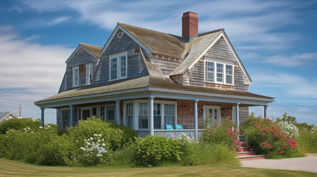 cape cod house exterior, with view of ocean and beach in the distance, created with generative ai