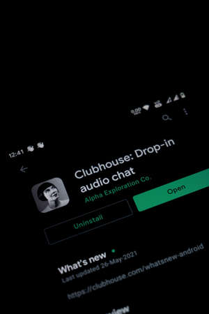 KERALA, INDIA - June 02, 2021: Drop-in audio chat app Clubhouse is appearing in Google Play Store on a smartphone.