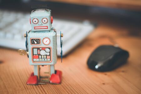 Robot toy, symbol for a chatbot or social bot and algorithms. Wood texture.
