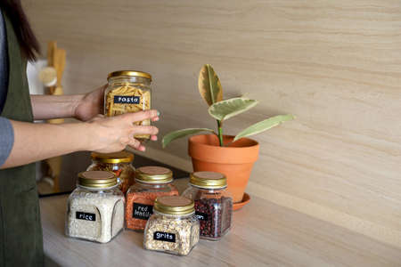 Young Asian woman stacks glass jars with horns in kitchen cabinet. Storage of bulk products. Zero waste. Vegetarian woman. Conscious consumption.
