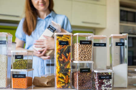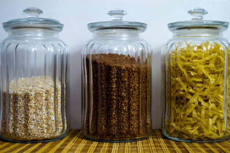 glass jars with grains and pasta, nuts and sugar on a kitchen table. sustainable home grocery storage and zero plastic house. eco friendly kitchen.
