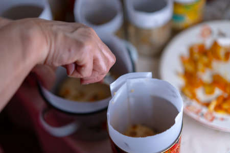On the kitchen table, there are jars with various products - pasta, marshmallows, nuts. A jar of pasta is in focus of the camera. Photo