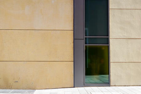 Huge wall on modern building with two windows and lines. Reflections in windows. Copy space