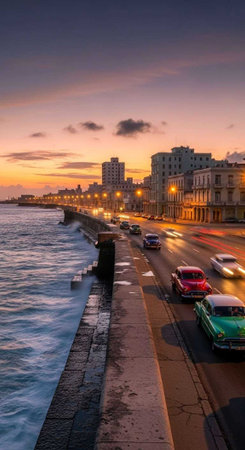 A scenic view of a coastal road with vintage cars driving by at sunset