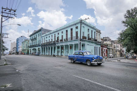 HAVANA, CUBA - DECEMBER 10, 2019: Havana Cuba Classic Cars. Typcal Havana urban scene with colorful buildings and old cars.