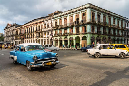 HAVANA, CUBA - APRIL 14, 2017: Authentic view of a street of Old Havana with old buildings and cars