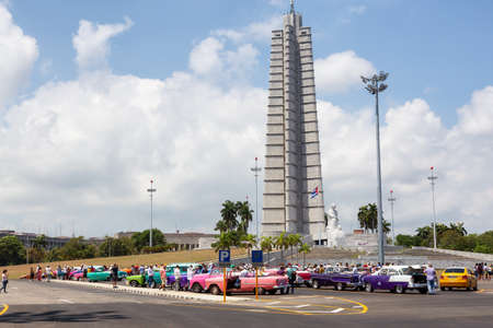 Havana, Cuba - May 19, 2019: Old Classic American Taxi Car at the Plaza de la Revolucion with Jose Marti Memorial in the background.