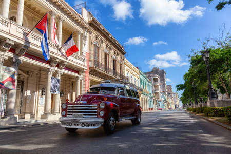 HAVANA, CUBA - DECEMBER 21, 2019: Vintage colored classic american cars front of the Galician Palace on Prado Street in Havana, Cuba.