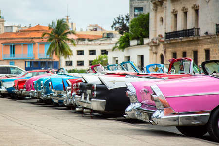 Havana, Cuba - November, 2018: Colorful vintage classic American cars parked on the street of Old Havana, Cuba
