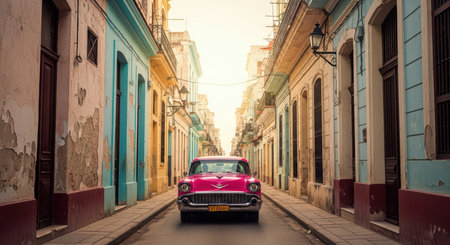 Vintage pink car driving through narrow colorful street in havana, cuba