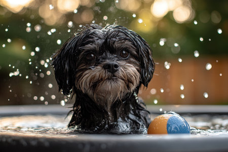 International Dog Day Photo - A small dog with wet fur is sitting in a pool, looking at the camera. The dog has a ball next to it and water is splashing around it.