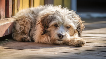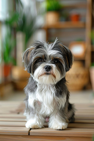 Adorable Small Dog with Fresh Groom, Sitting on Wooden Porch, Home Pet Care Concept, Portrait