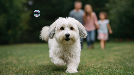 A playful white dog joyfully runs towards the camera while a family walks in the background. This scene captures happiness and the bond between pets and family in a beautiful park setting.