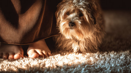 A small, fluffy dog is sitting beside bare feet on a plush rug, capturing the warm, inviting atmosphere of a cozy room in afternoon light.