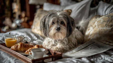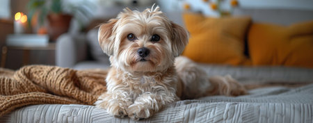 A cute dog lying on a bed with soft, gray bedding, looking relaxed and comfortable in a cozy bedroom. High quality photo