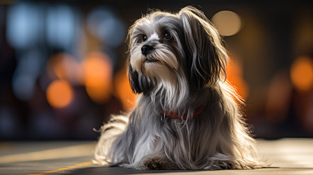 A Shih Tzu (Canis lupus familiaris) poised at a dog show, its long silky coat, carefully groomed and tied topknot creating an elegant picture.