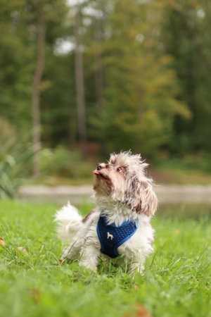 crossbreed Yorkshire terrier is on a meadow near the forest for a walk. it's summer and the weather is beautiful