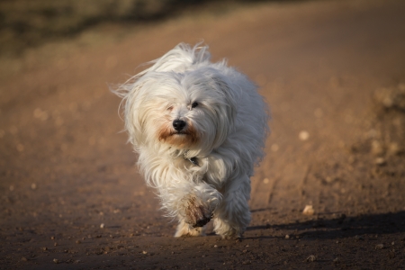 A Havanese trots very loosely on a dirty, brown path on the photographer