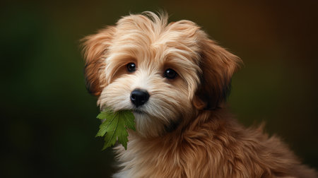 A charming puppy captures the essence of playfulness while holding a green leaf. This image radiates warmth and innocence, perfect for nature or pet-themed projects.